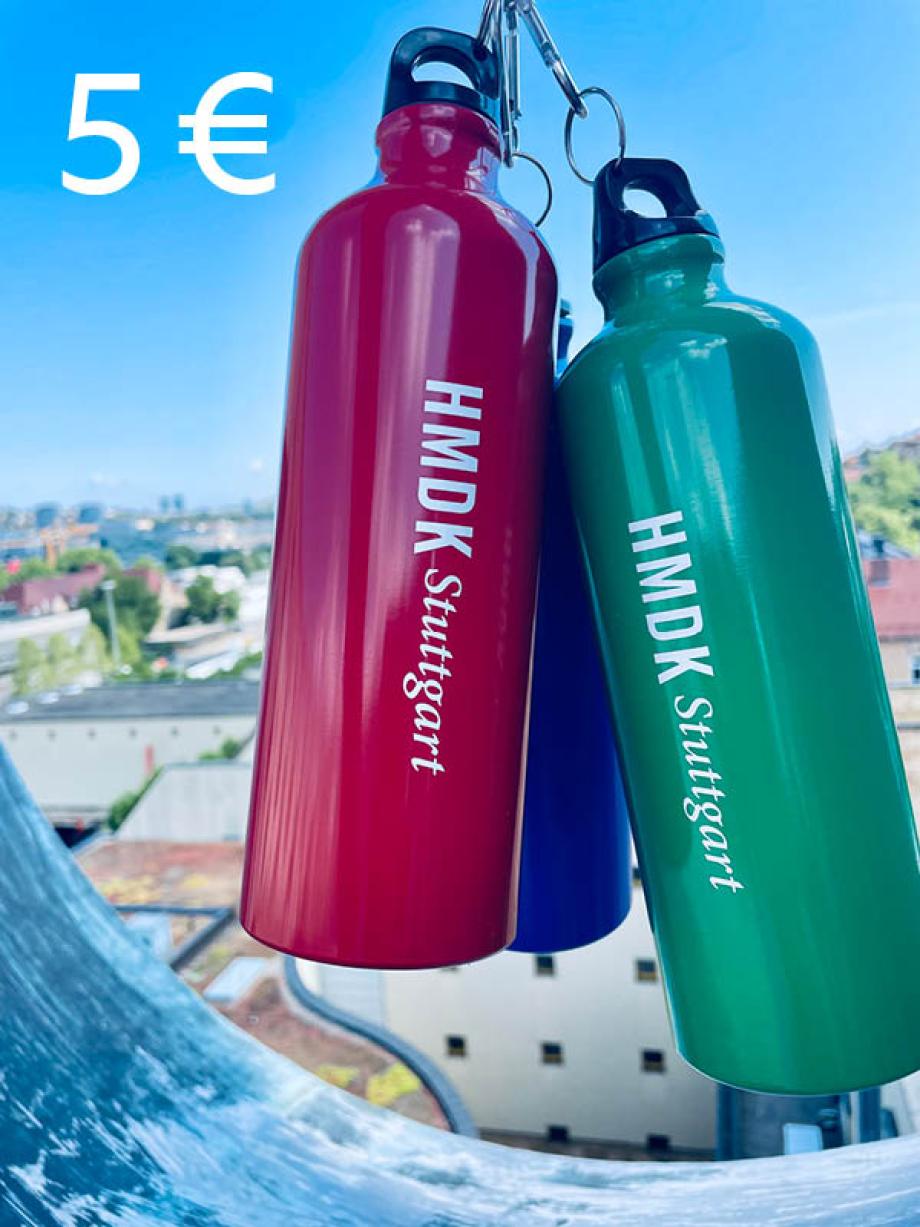 Aluminum bottles with engraved HMDK logo for 5 € each. Available in blue, green, red. Featuring a practical carabiner for backpack attachment and a capacity of 800 ml, not dishwasher safe, with a BPA-free interior coating.