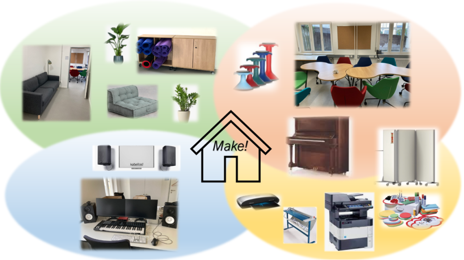 Based on an initial idea by Professor Dr Karolin Schmitt-Weidmann, a Maker Space concept for the HMDK Stuttgart was developed and implemented in the academic year 2023/24 through a participatory process involving students, teachers from different departments, facility management and technical services, administration, and the rectorate. The aim was to create a learning environment that could be used for a wide range of teaching and learning scenarios at HMDK Stuttgart – from theoretical seminars to dance and performance – based on highly flexible and coordinated equipment features. Today, a complete rear building at Willy-Brandt-Straße 10 is available, housing two seminar rooms, an office, a storage room, and a kitchen. The idea list at hand was approached with the vision to continuously evolve, supplement, and redesign the Maker Space, additionally by expanding the “real” Maker Space with “mobile” and “virtual” spaces.