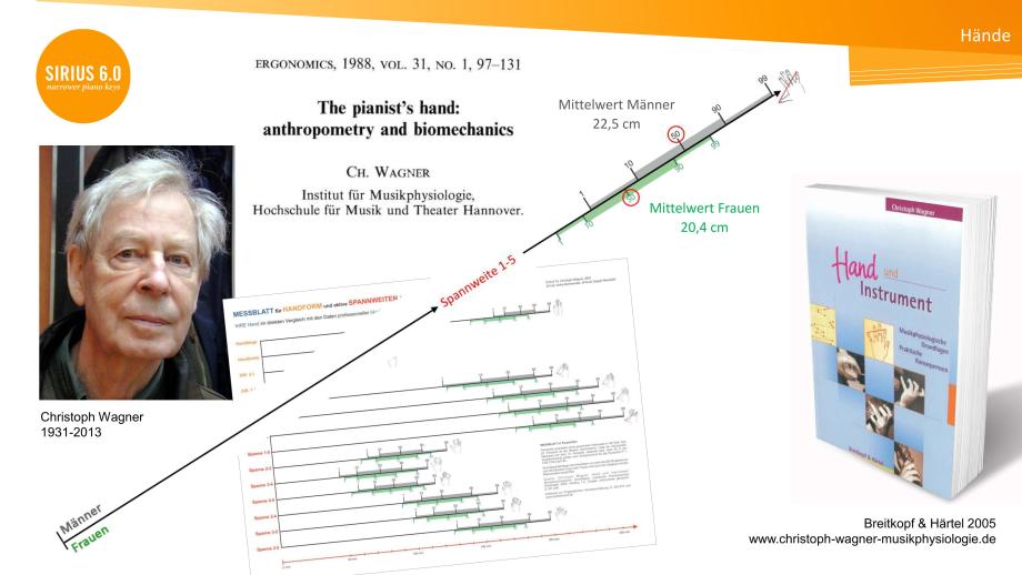 Wissenschaftliche Grundlage sind Daten von Pianistinnen und Pianisten für mehr als 50 Handeigenschaften (Spannweiten, Rotationswinkel etc.), kausale Zusammenhänge von spielbedingten muskuloskeletalen Überlastungssyndromen (Sehnenüberreizung, Ganglion, einschlafende Finger etc.) und geringen Spannweiten, schmaler mensurierte Hammerflügel 1785-1825 und der Gender-Gap bei Klavierwettbewerben mit romantischem Repertoire.