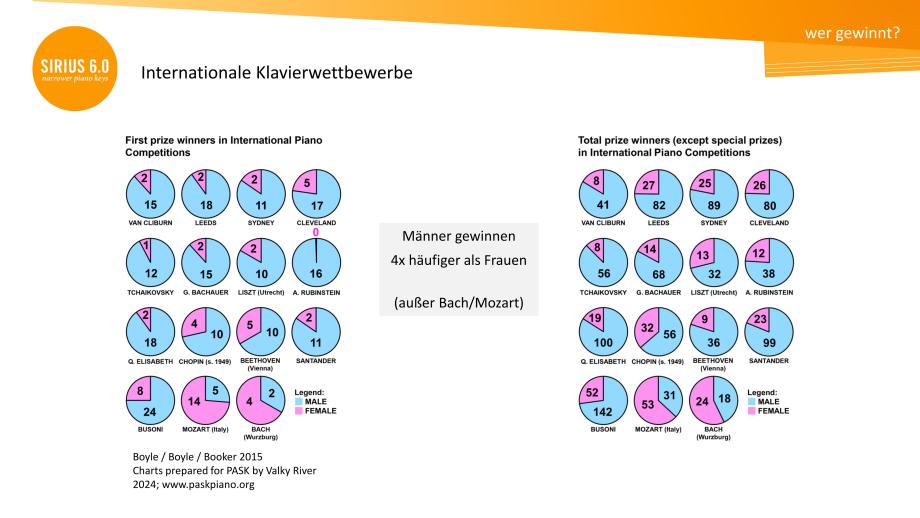 Chancengleichheit für Pianist*innen beginnt auf ihrem tagtäglichen Spielfeld. Wen wundert es noch, dass Klavierwettbewerbe viel häufiger von Männern gewonnen werden als von Frauen? Die Daten von Musiker*innen belegen bei der Spannweite 1-5 individuelle Unterschiede von bis zu 10,9 cm. Der Mittelwert von Frauen liegt dabei 2,1cm unter dem von Männern (… fast eine Taste). Der Mittelwert von z.B. Asiatinnen liegt 6 mm unter dem Mittelwert von Europäerinnen. Ist die seit 1880 bestehende DIN Norm also vor allem für große europäische Männerhände gedacht?