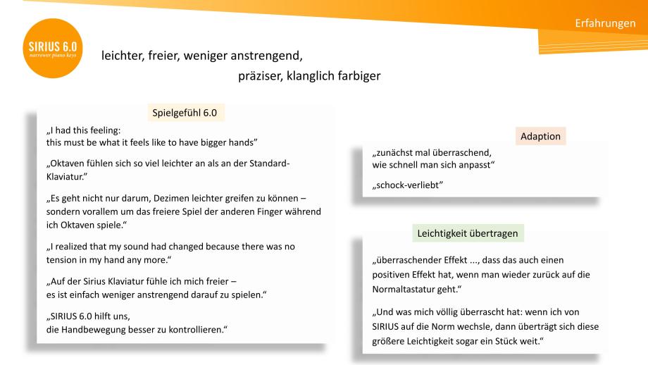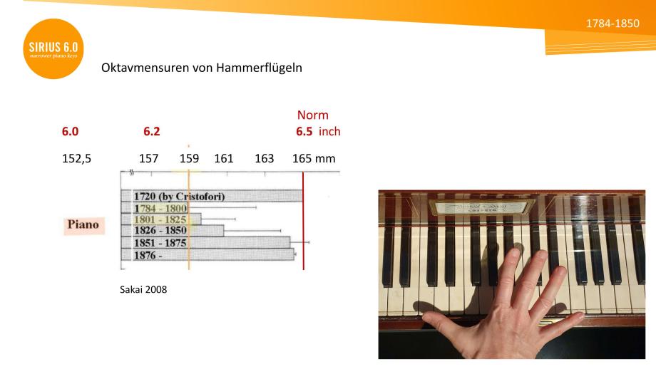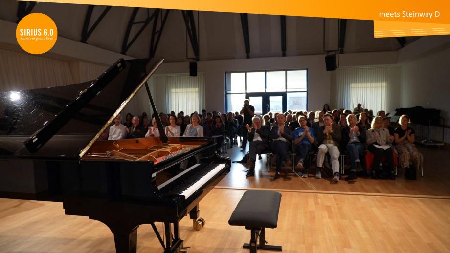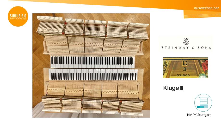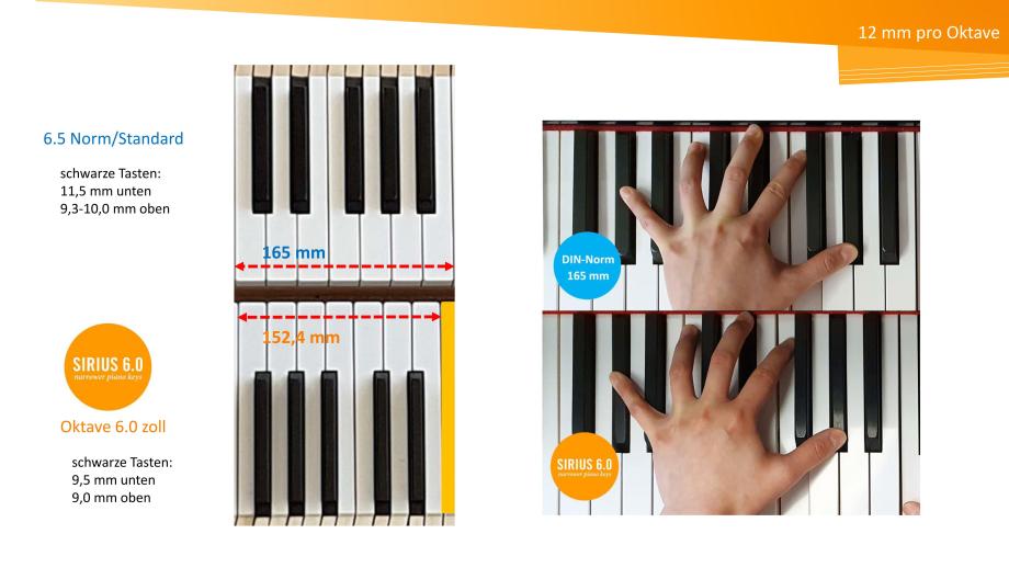 SIRIUS 6.0 Klaviaturen lassen Hände um eine halbe Taste pro Oktave ‚wachsen‘. Selbst Pianist*innen, die an Normklaviaturen eine Dezime erreichen, erleben an SIRIUS 6.0 Klaviaturen ein freieres Spielgefühl, geringere Anstrengung, höhere Präzision und feinere Klangbalance. Fast alle sind überrascht, wie schnell sie adaptieren – von der 6.5 inch-DIN-Norm (165 mm/Oktave) zu 6.0 (152,4 mm) und zurück. Viele können eine gewisse Leichtigkeit auf die Normklaviatur übertragen Sharing Experiences with SIRIUS 6.0.
