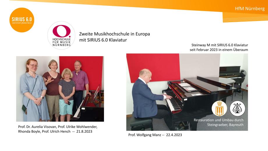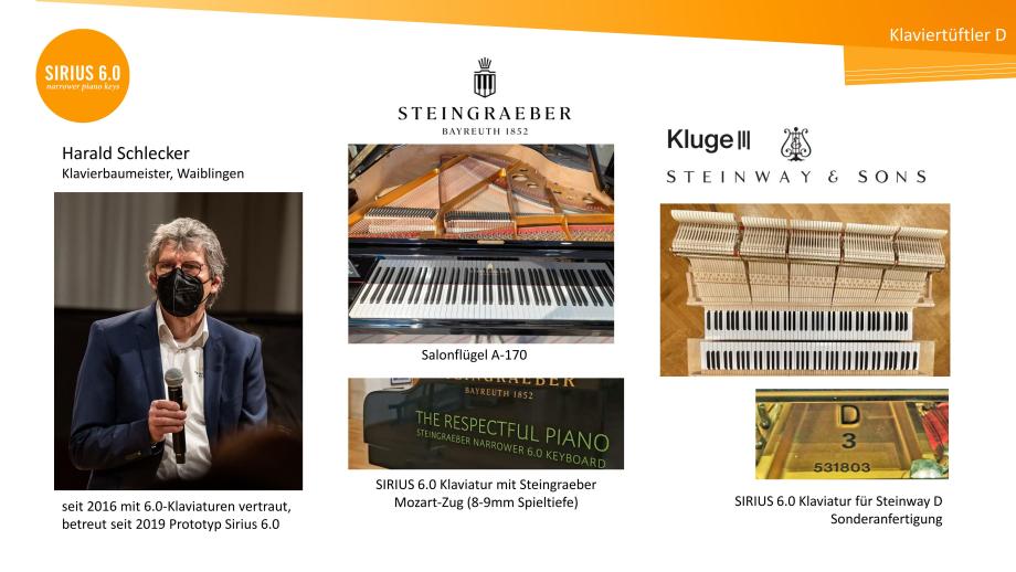 Wir führen einerseits die musikphysiologische Forschung von Christoph Wagner in Kooperation mit dem Zürcher Zentrums Musikerhand mit klavierspezifischem Fokus weiter und andererseits das Konzept individueller Klaviaturmensuren, das in den 1990er Jahren in den USA mit Steinbuhler-Klaviaturen in 6.0 und 5.5-Mensur begann und an etlichen amerikanischen Universitäten verbreitet ist. Auch Daniel Barenboim spielt seit mindestens 2008 eine Klaviatur mit ca. 7 mm kürzeren Oktaven. Seit 2024 unterstützt er das globale Stretto Piano Festival.