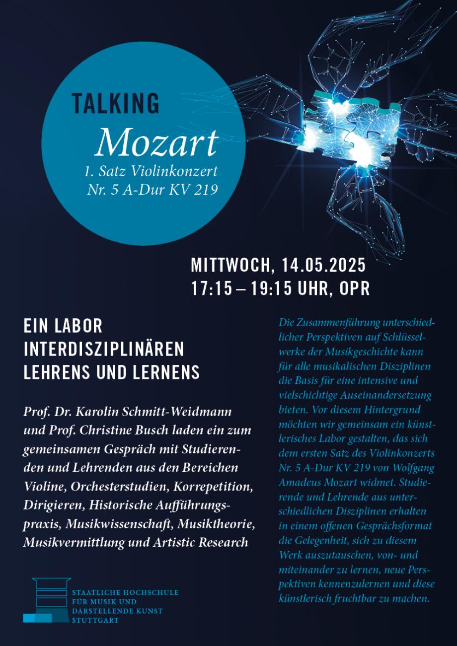 Die Zusammenführung unterschiedlicher Perspektiven auf Schlüsselwerke der Musikgeschichte kann für alle musikalischen Disziplinen die Basis für eine intensive und vielschichtige Auseinandersetzung bieten. Vor diesem Hintergrund möchten wir gemeinsam ein künstlerisches Labor gestalten, das sich dem Violinkonzert Nr. 5 A-Dur KV 219 von Wolfgang Amadeus Mozart widmet. Studierende und Lehrende aus unterschiedlichen Disziplinen erhalten in einem offenen Gesprächsformat die Gelegenheit, sich zu diesem Werk auszutauschen, von- und miteinander zu lernen, neue Perspektiven kennenzulernen und diese künstlerisch fruchtbar zu machen.